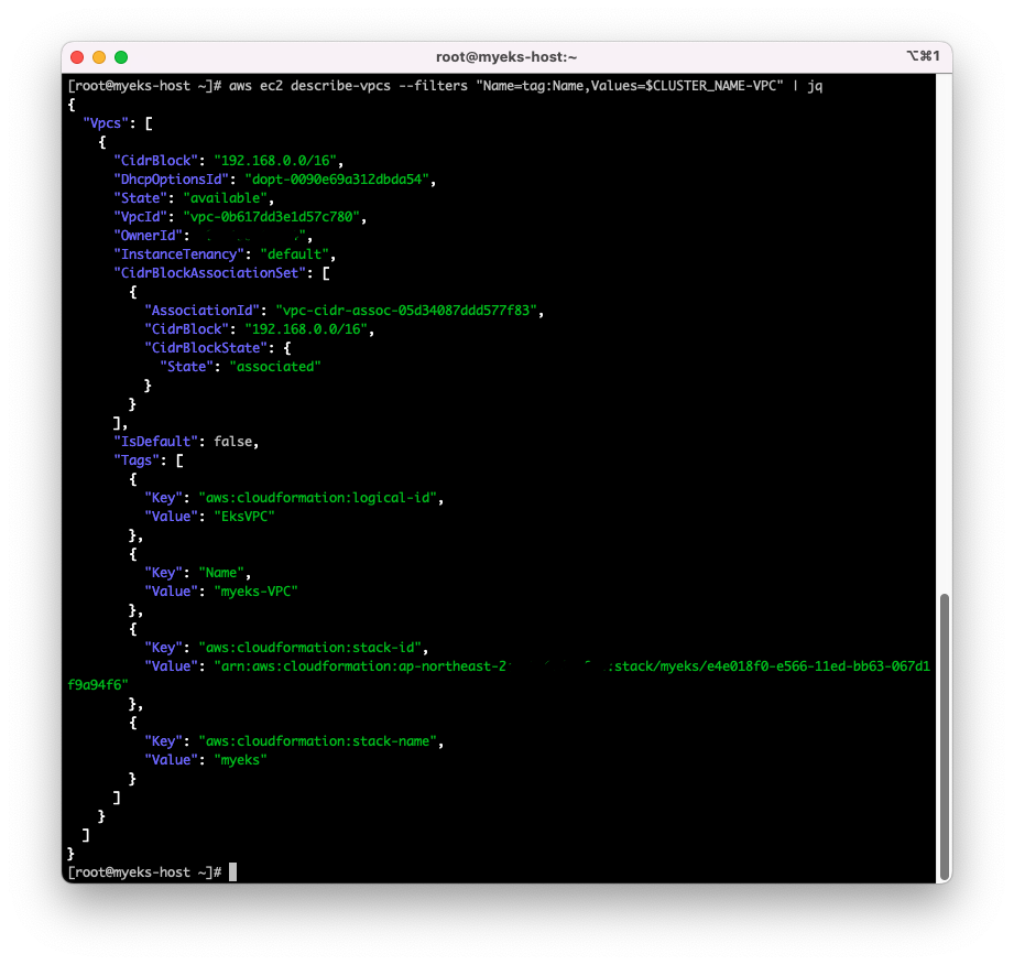export VPCID=$(aws ec2 describe-vpcs --filters "Name=tag:Name,Values=$CLUSTER_NAME-VPC" | jq -r .Vpcs[].VpcId)