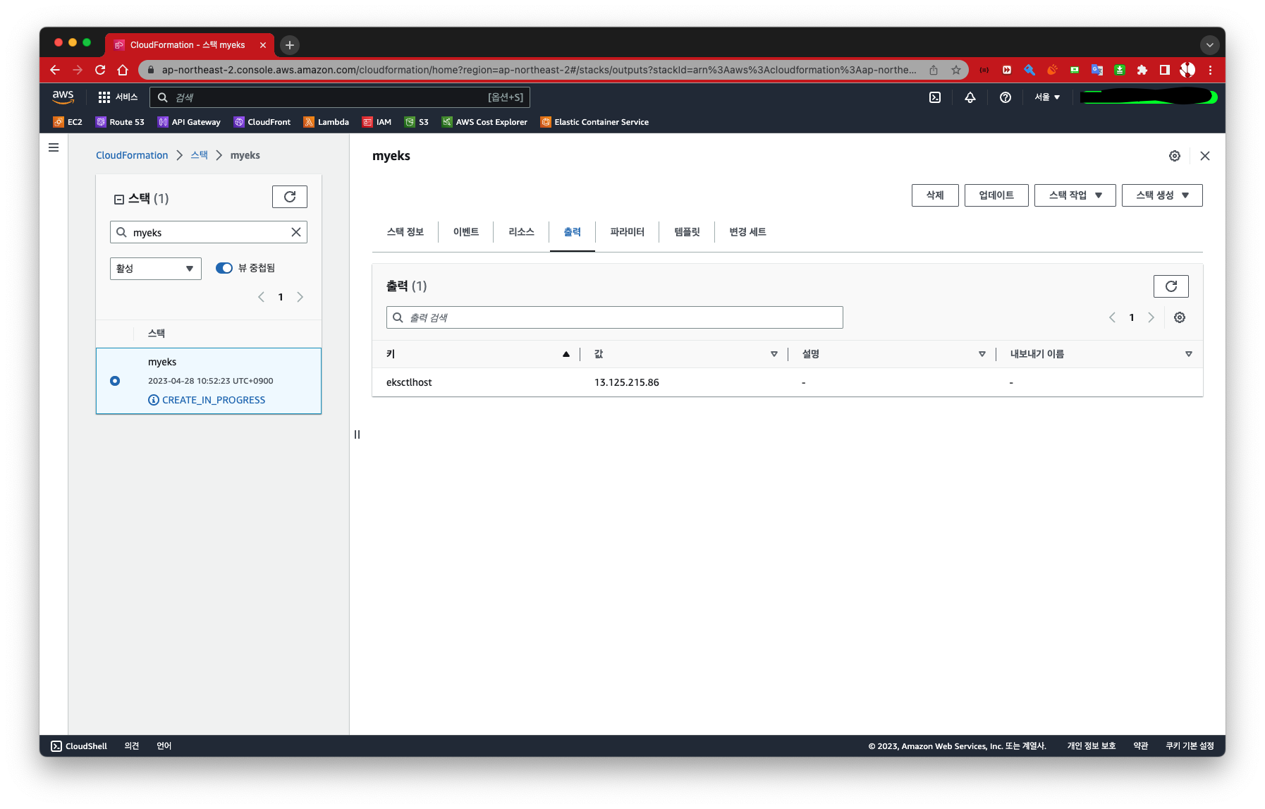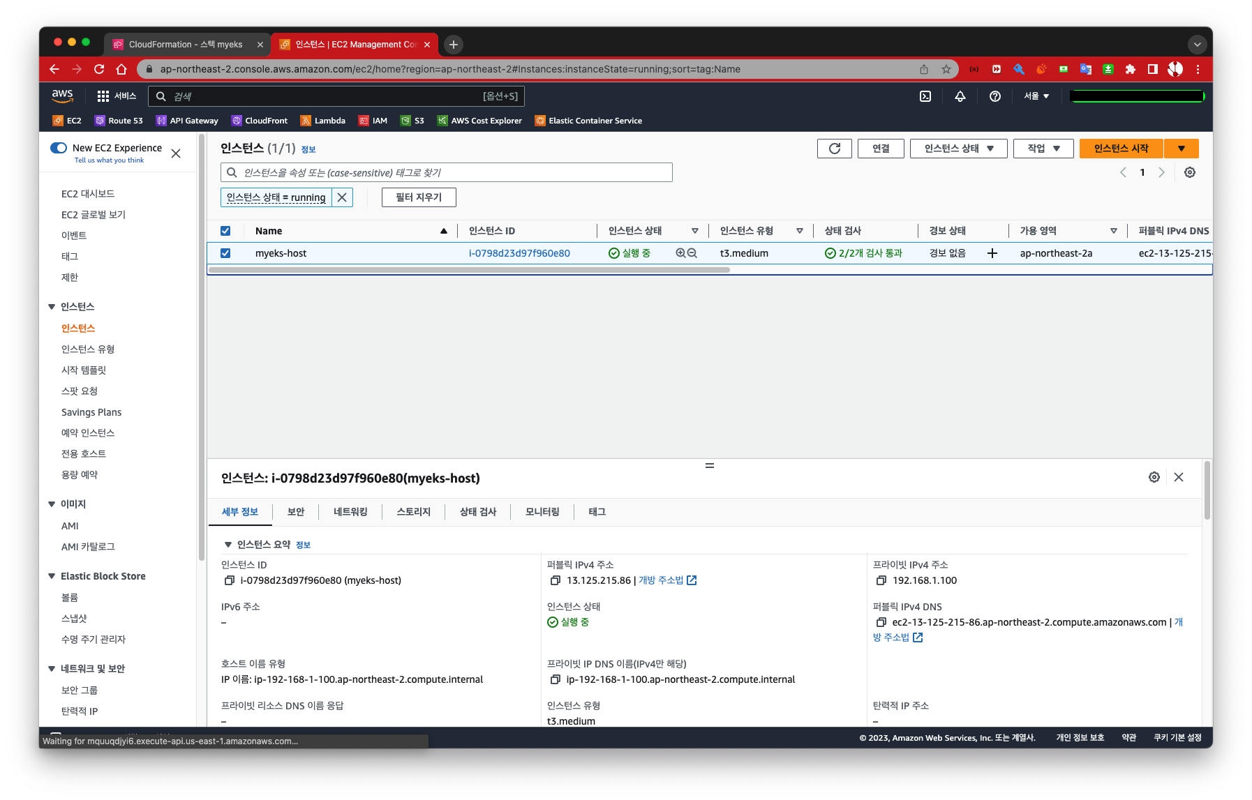 인스턴스가 하나 실행되어 있고, 인스턴스의 퍼블릭 IPv4가 CloudFormation의 출력과 동일한 것을 확인할 수 있습니다.