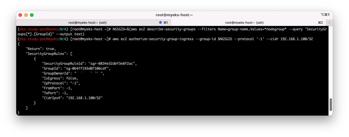 N1, N2 인스턴스(myeks-myeks-nodegroup-Node) 둘 다 동일한 보안그룹을 갖습니다.