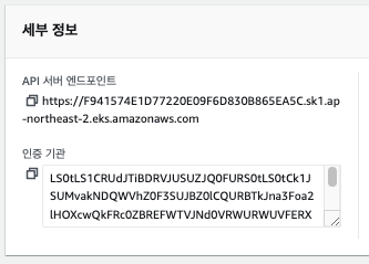 클러스터 생성이 완료된 후 Amazon EKS 콘솔에서는 API 서버 엔드포인트를 확인할 수 있습니다.