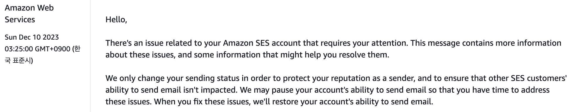정말 단어 하나하나 조심스럽게 작성해서 회신을 했더니 모두의 예상과 다르게 24시간이 채 지나지 않아 SES 서비스의 pause가 해지되었다. (내용은 미포함)