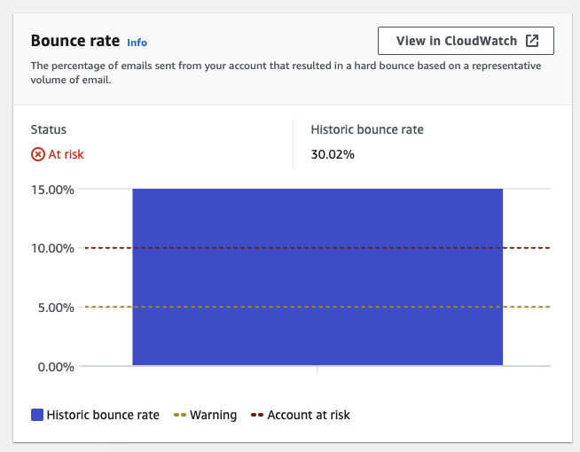 얼른 AWS 콘솔에 들어가 확인해보니, SES 서비스가 pause되어 있었다. 반송률(Bounce rate)가 30%가 넘었고 해당 서비스 계정은 pause라고 빨갛게 표시가 되어 있었다.