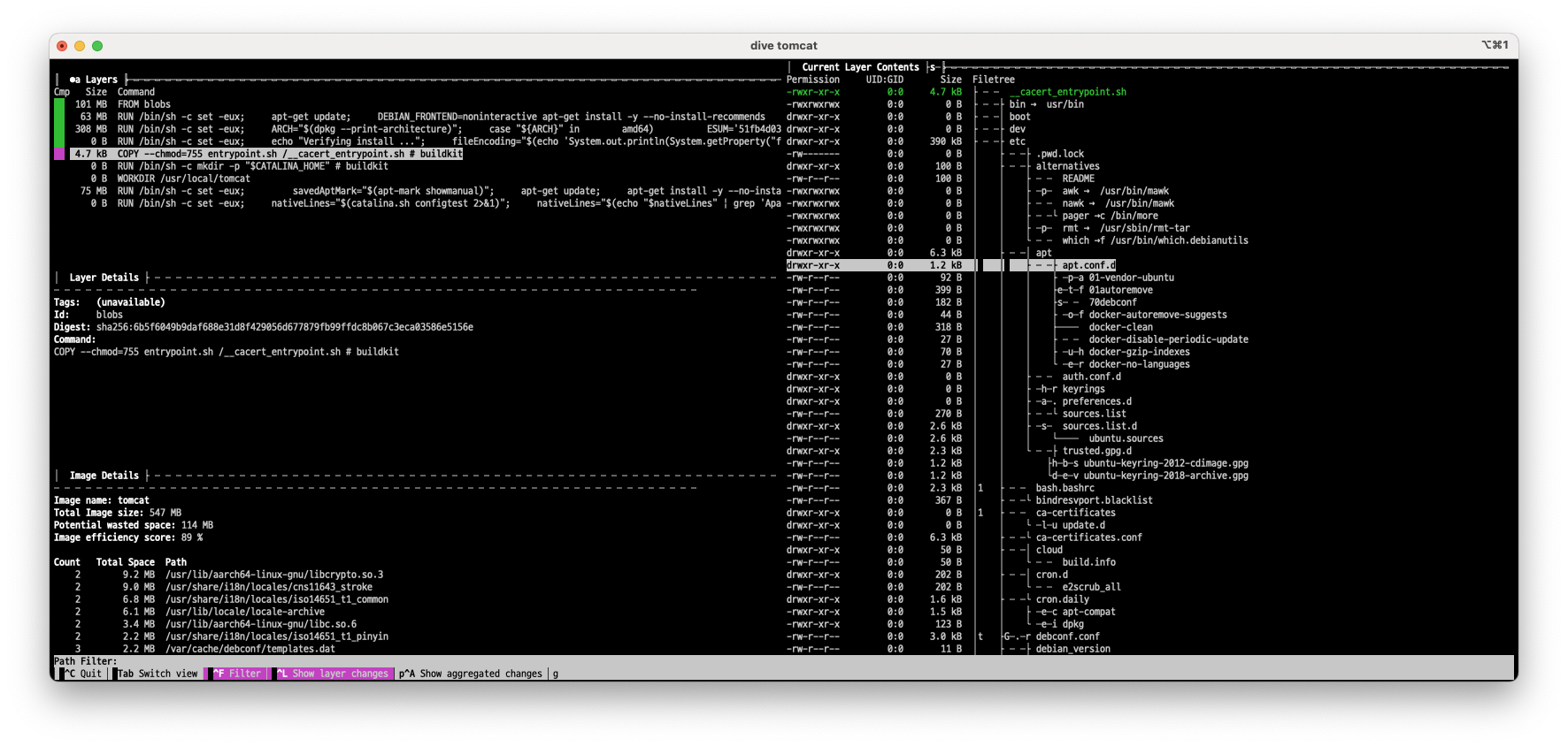 https://github.com/wagoodman/dive 에서 제공하는 dive라는 도구를 사용하면 도커 이미지를 분석해볼 수 있습니다.