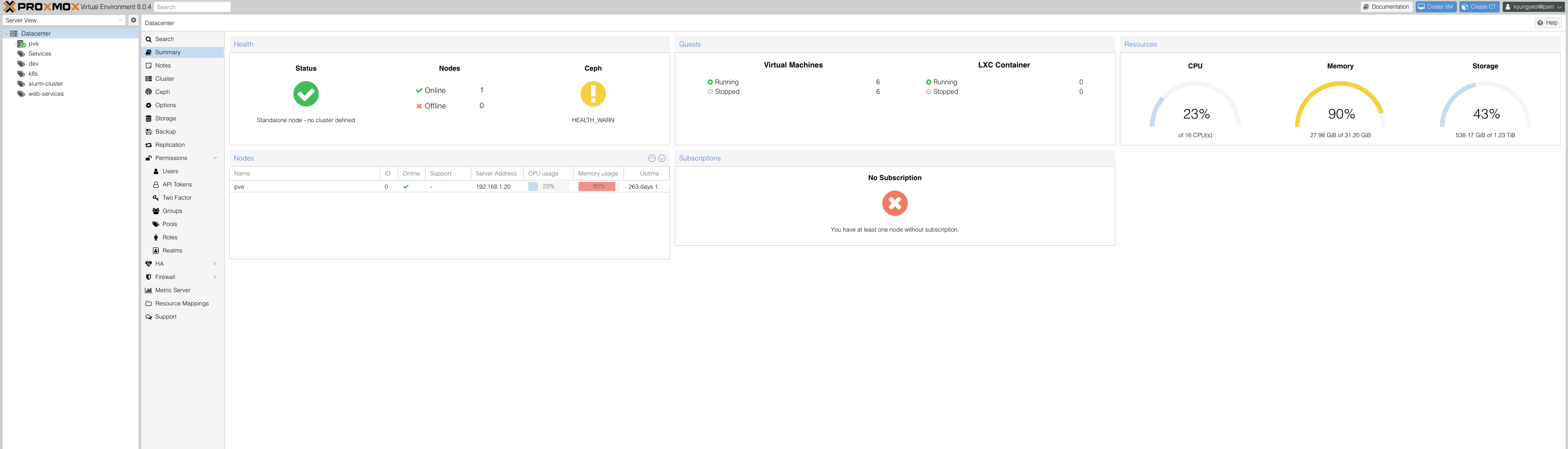 proxmox를 k8s 클러스터 목적으로 구매하기 보다는 홈 클라우드 환경을 구축하기 위해 구매. 현재는 집에서 운영 레벨의 k8s를 구축하여 kind나 미니큐브 같은 경량화 모델의 단점을 해소하고 운영 환경을 직접 구현해보기 위한 용도로 사용중