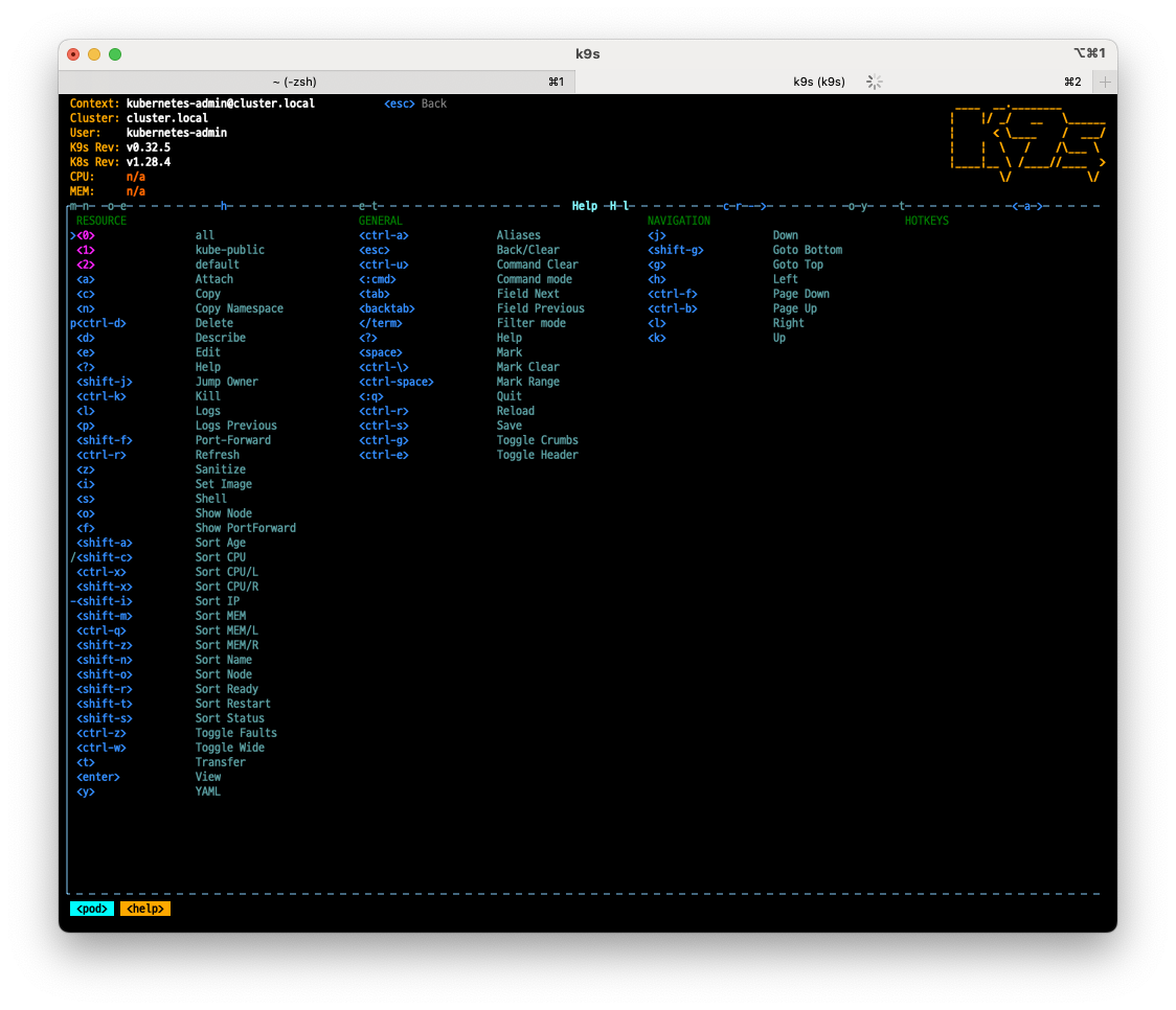 k9s에서 사용할 수 있는 단축키를 확인하는 방법은 '?' 키를 눌러보면 된다.