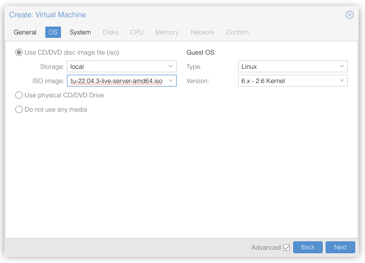 미리 받아둔 iso 이미지 중에 현재 vm에서 사용할 iso 이미지를 선택합니다. iso 이미지는 proxmox 콘솔에서 url로 다운로드 받거나 내가 갖고 있는 iso 이미지를 업로드하여 사용할 수 있습니다.