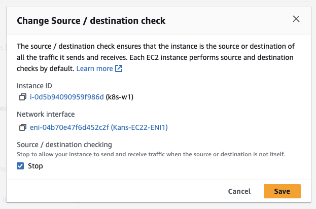 - AWS에서 이 모드를 사용하려면 다음과 같이 Source/Destination Check 기능을 Disable 해야합니다.