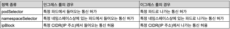 - 특정 pod, 특정 namespace, 특정 ip block
