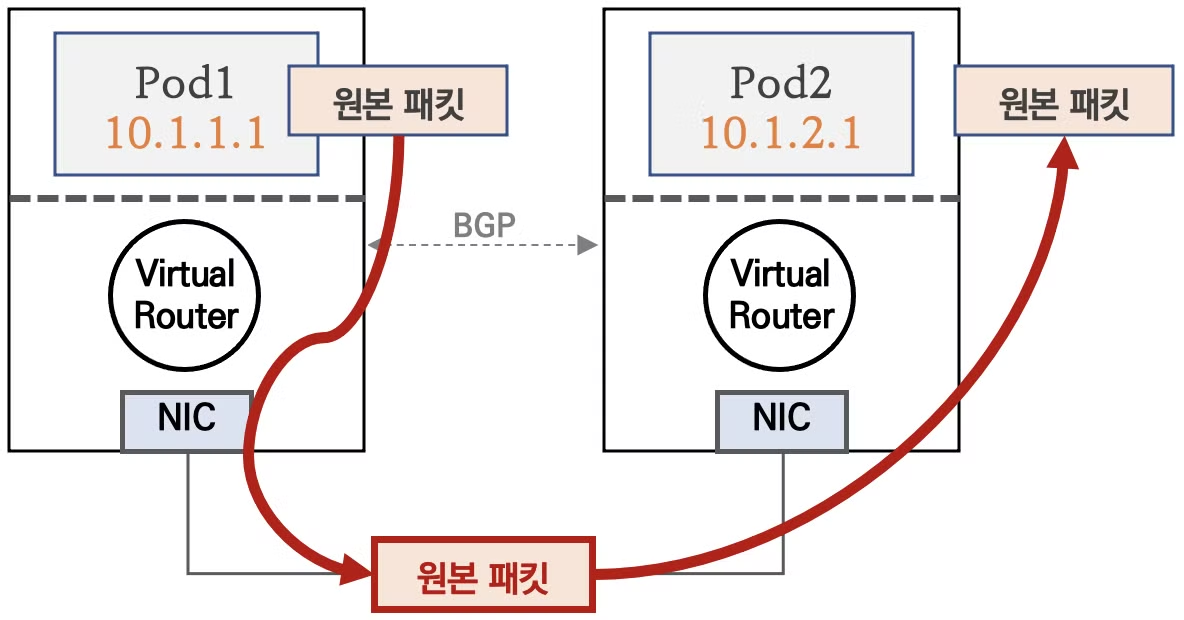 - IPIP 모드와 달리 파드 통신이 출발지 노드의 라우팅 정보를 확인해 목적지 노드로 원본 그대로 전달합니다.