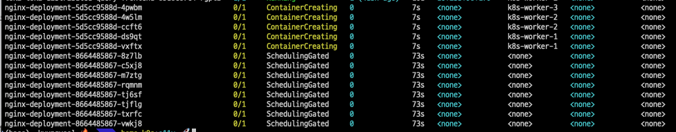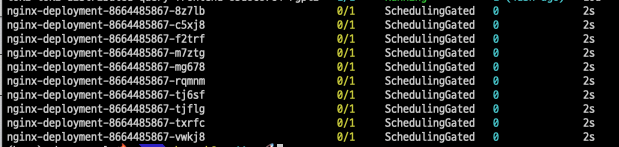 deployment set에서 scheduling gate 태그를 삭제하게 되면 새로운 레플리카 셋으로 파드가 실행됩니다.