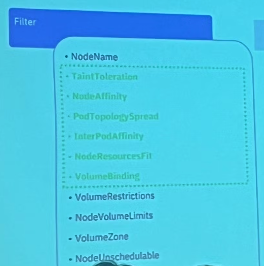 필터링에서는 어떤 노드를 선택할지를 결정하는 단계라고 이해할 수 있습니다. taint, toleration, affinity, resource availability 등에 따라서 현재 파드가 배포가될 수 있는지 여부를 확인하는 단계입니다. 이를 통해서 선택된 워커노드 목록중 파드가 배포될 수 있는 파드를 (말그대로) 필터링 한다고 생각할 수 있습니다.
