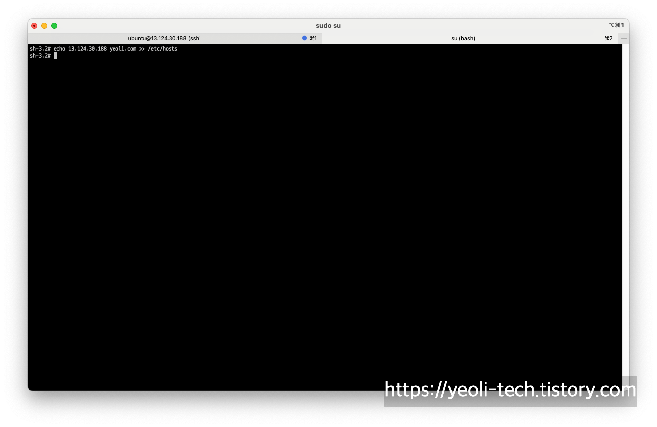 이후 내 PC에서 host 파일을 수정해야합니다. root 계정에서 아래 명령어를 사용하여 hosts 파일을 수정해줍니다.