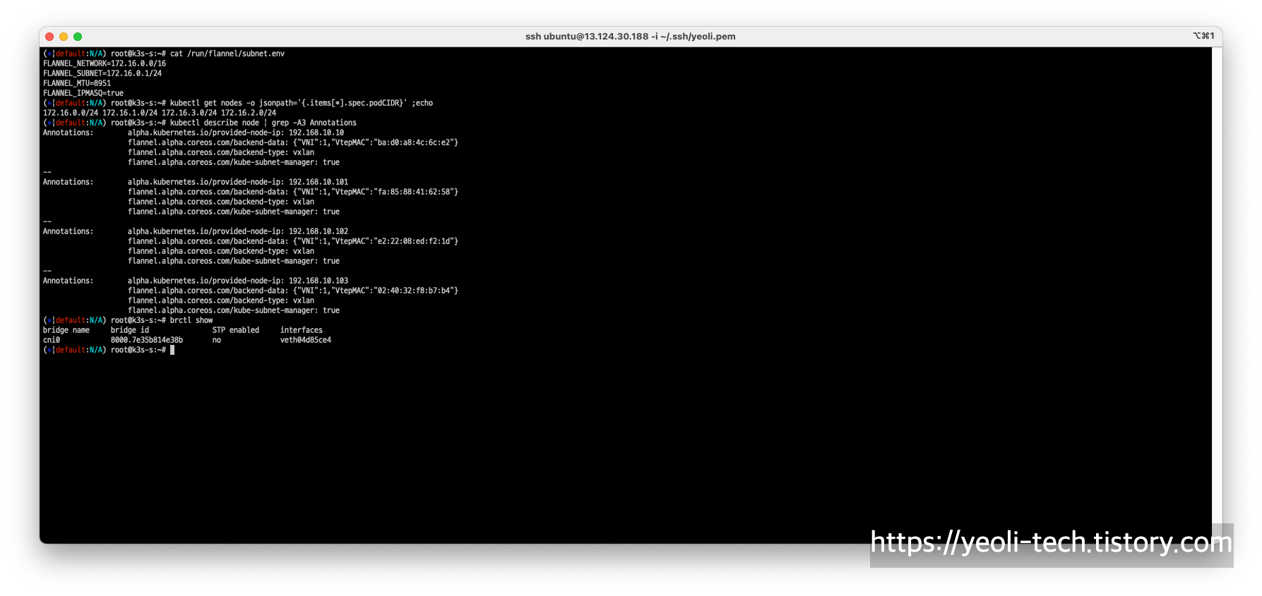 # 노드의 annotation 정보. 여기서는 각 노드의 flannel cni 구성 정보 확인