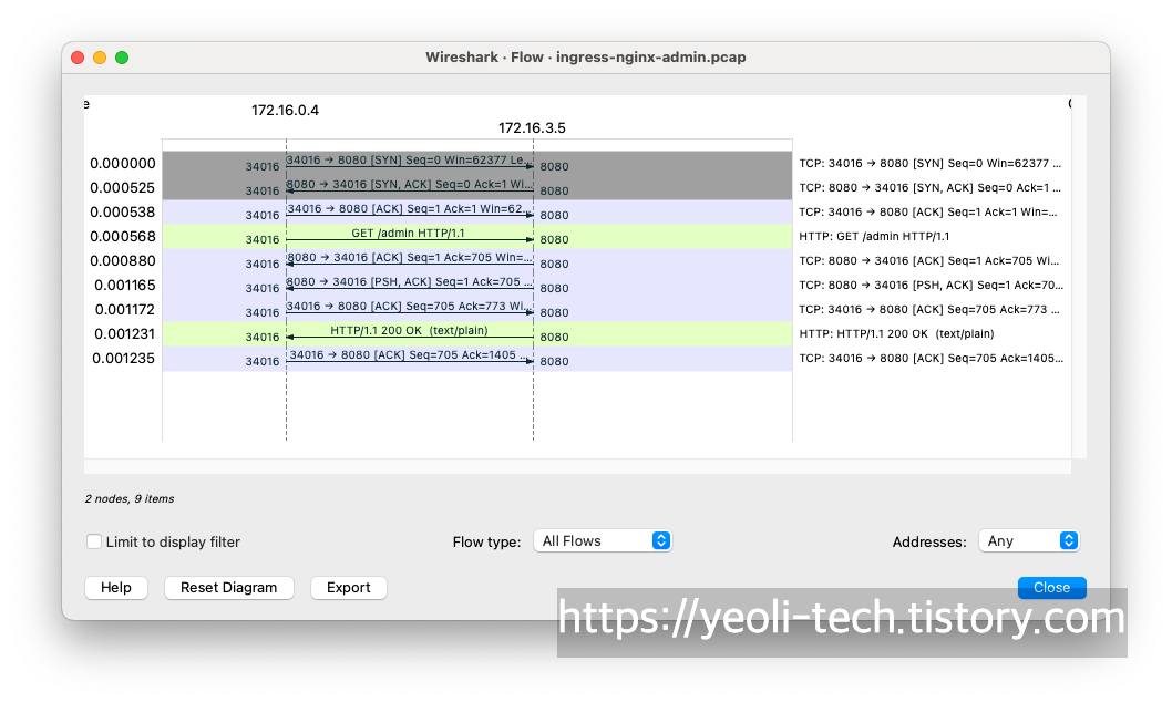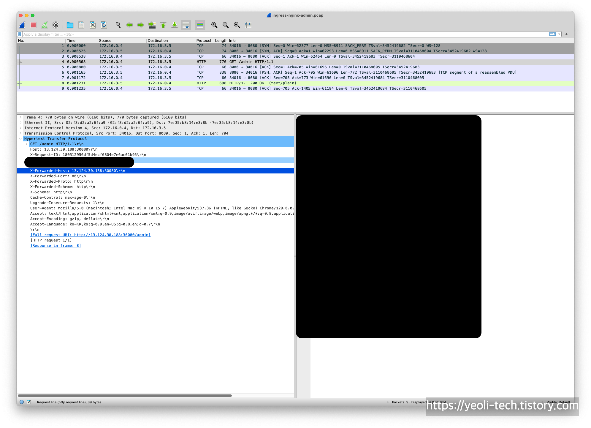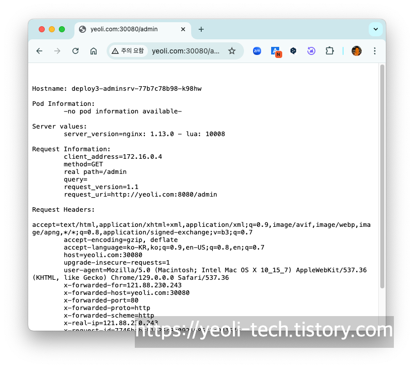 HTTP 요청에서는 요청자 IP(저의 public ip)와 클러스터의 노드포트 정보가 포함되어 있습니다.