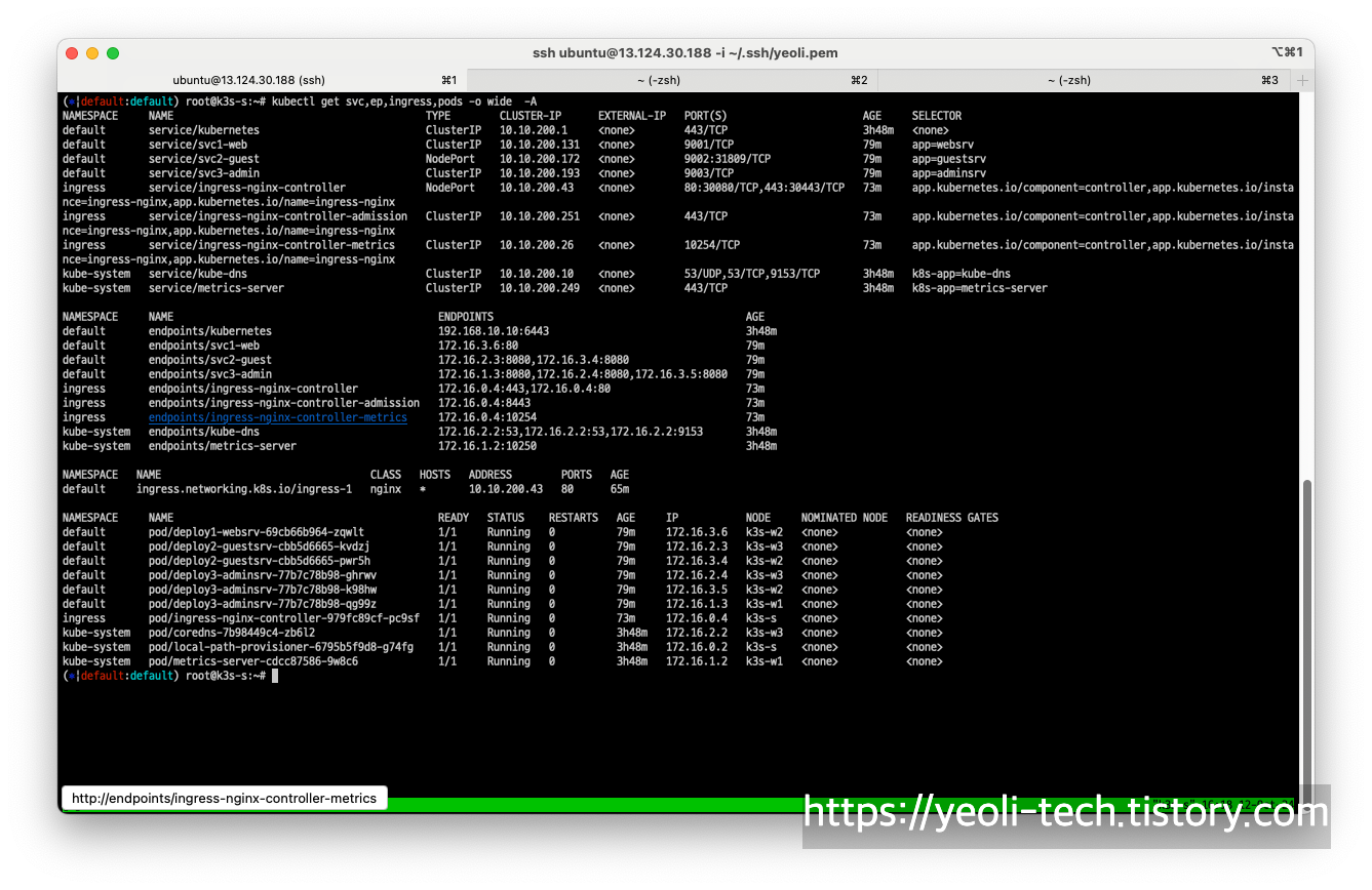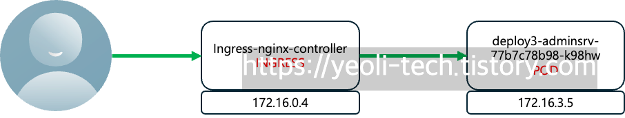 이를 cluster에서 리소스를 조회해보면 172.16.0.4는 ingress controller의 ip, 172.16.3.5는 admin pod의 ip로 확인됩니다.