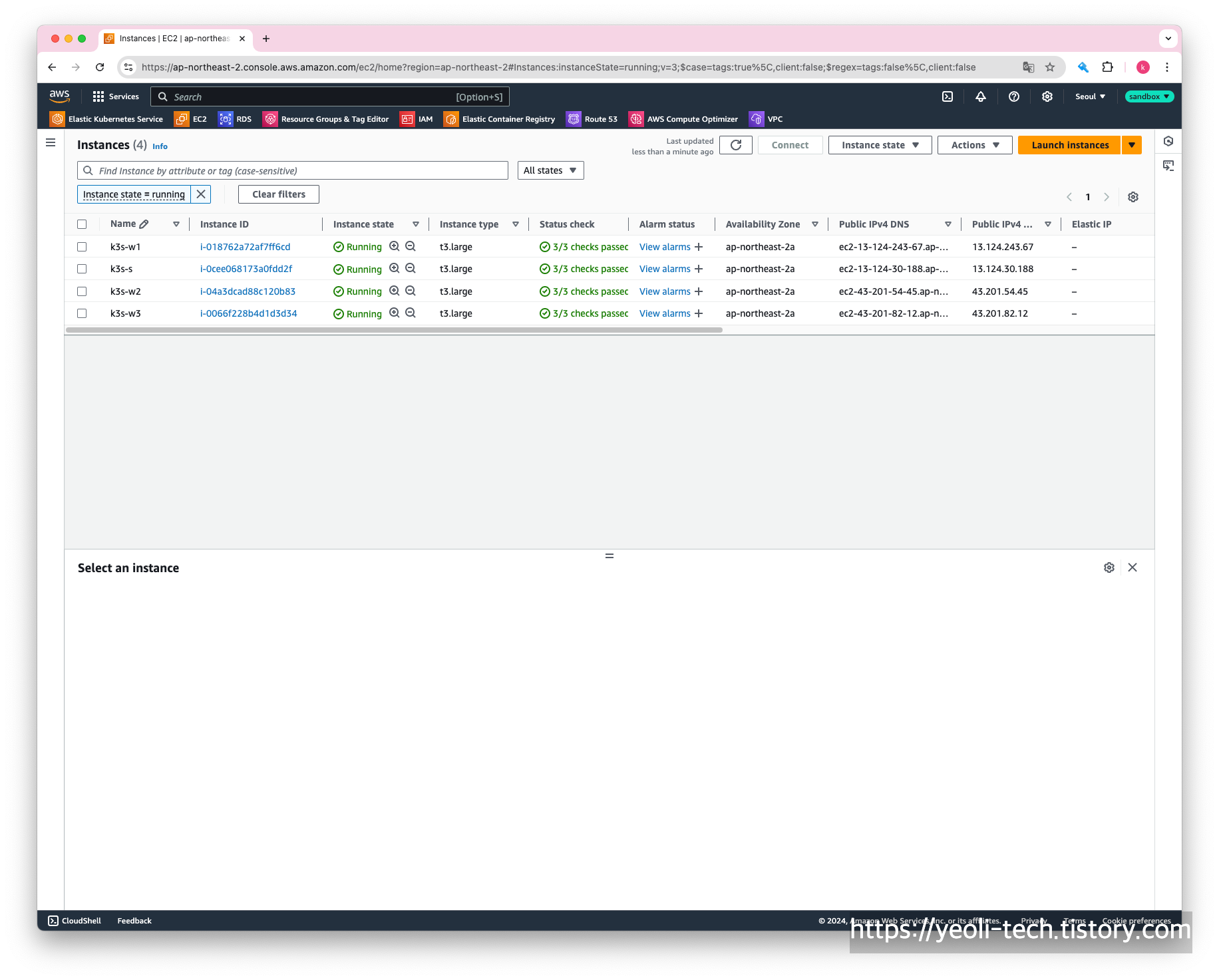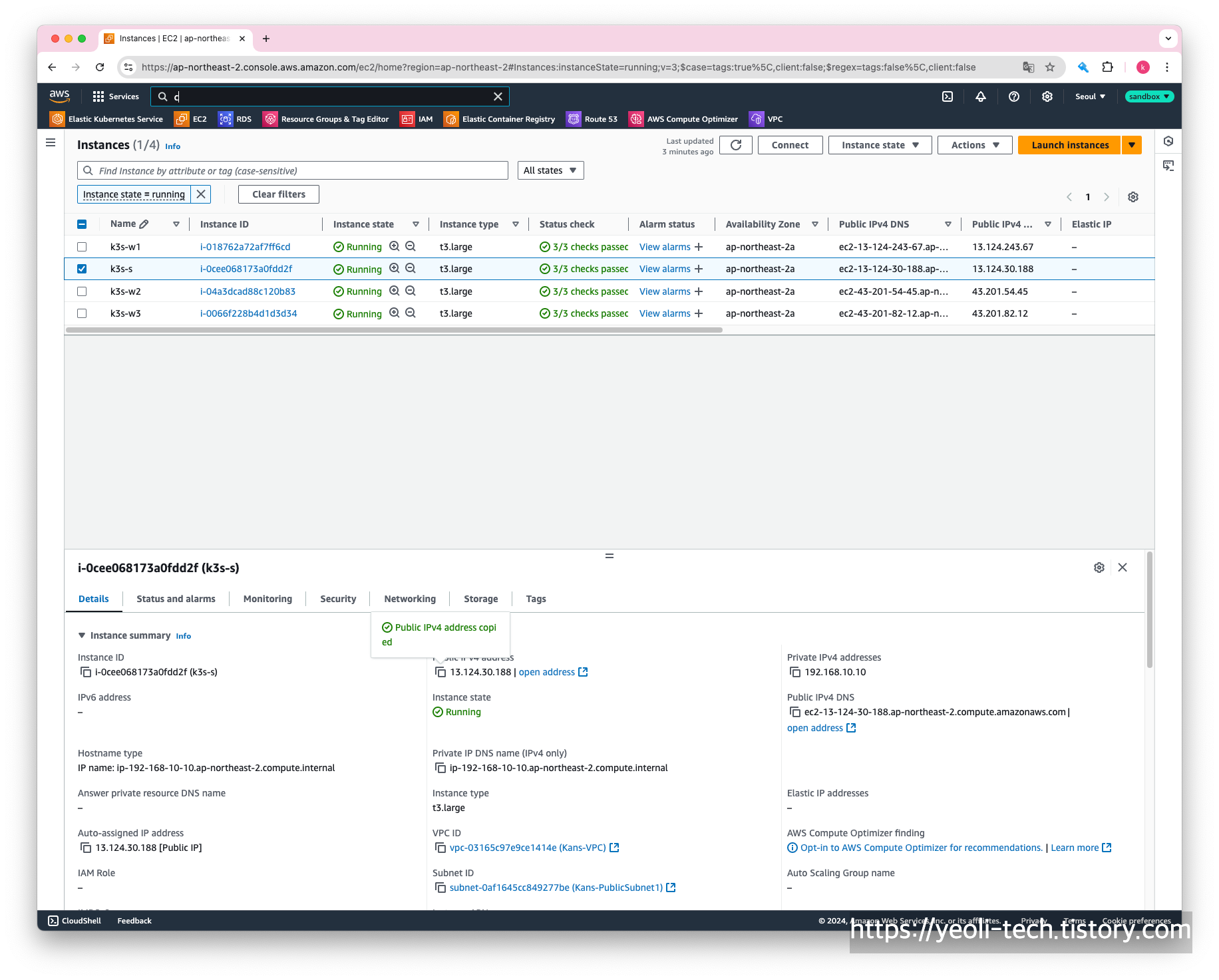 먼저, EC2 서비스에서 k3s-s 인스턴스의 public IP를 확인합니다.