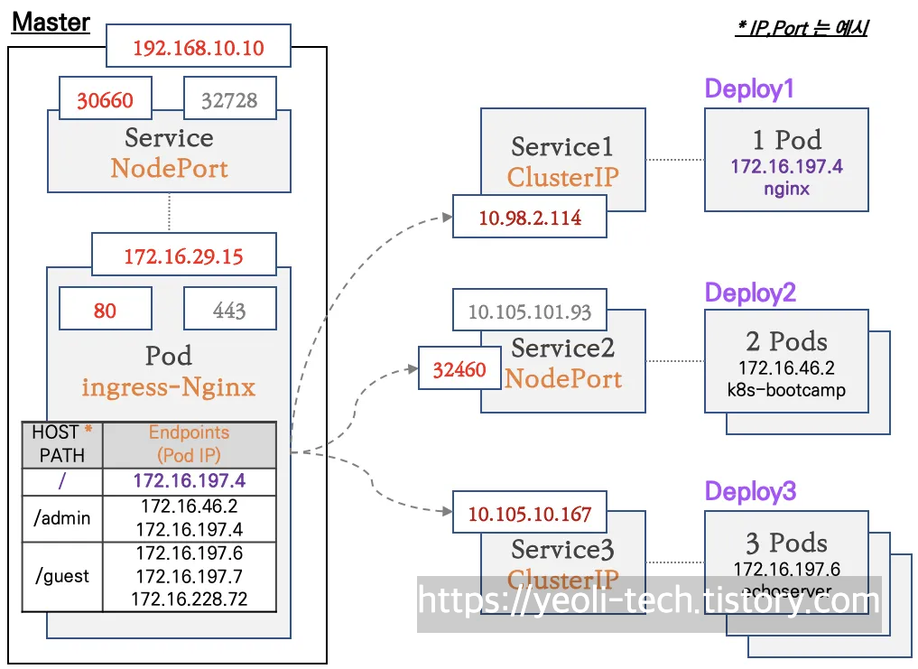 서비스의 노드포트나 로드밸런서 타입도 물론 클러스터 외부의 요청을 내부로 전달할 수 있지만 인그레스는 조금 다르게 동작합니다.