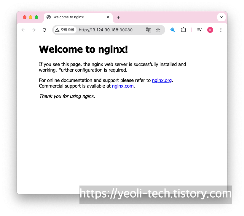 컨트롤러의 인입 포트(30080)와 Public IP(13.124.30.188)를 확인한 다음 Rule에 맞게 url을 입력하여 접속해보겠습니다.