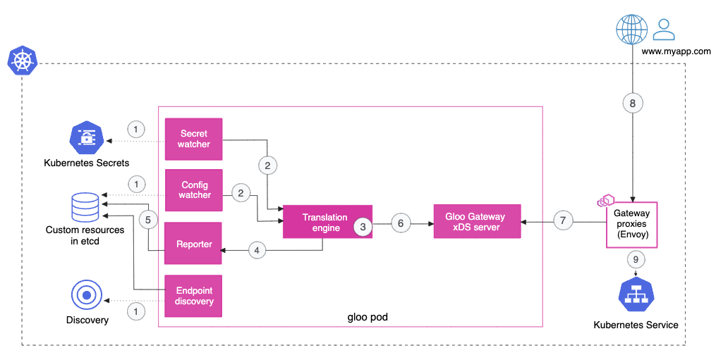 - 2. When the config or secret watcher detect new or updated resources, it sends the resource configuration to the Gloo Gateway translation engine.