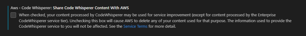 - 설정에서 아래 설정을 끄게 되면, AWS에서 사용자 데이터를 공유하지 않습니다.