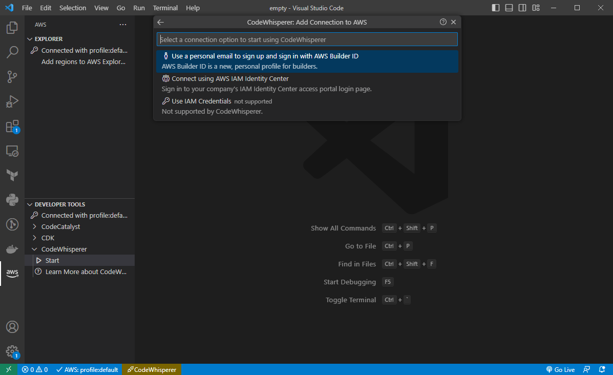 그럼 위 그림과 같이 3개의 선택지가 생깁니다. 우리는 일반 사용자를 위한 AWS CodeWhisperer를 사용하기 위해 첫 번째 항목을 선택해주세요.
