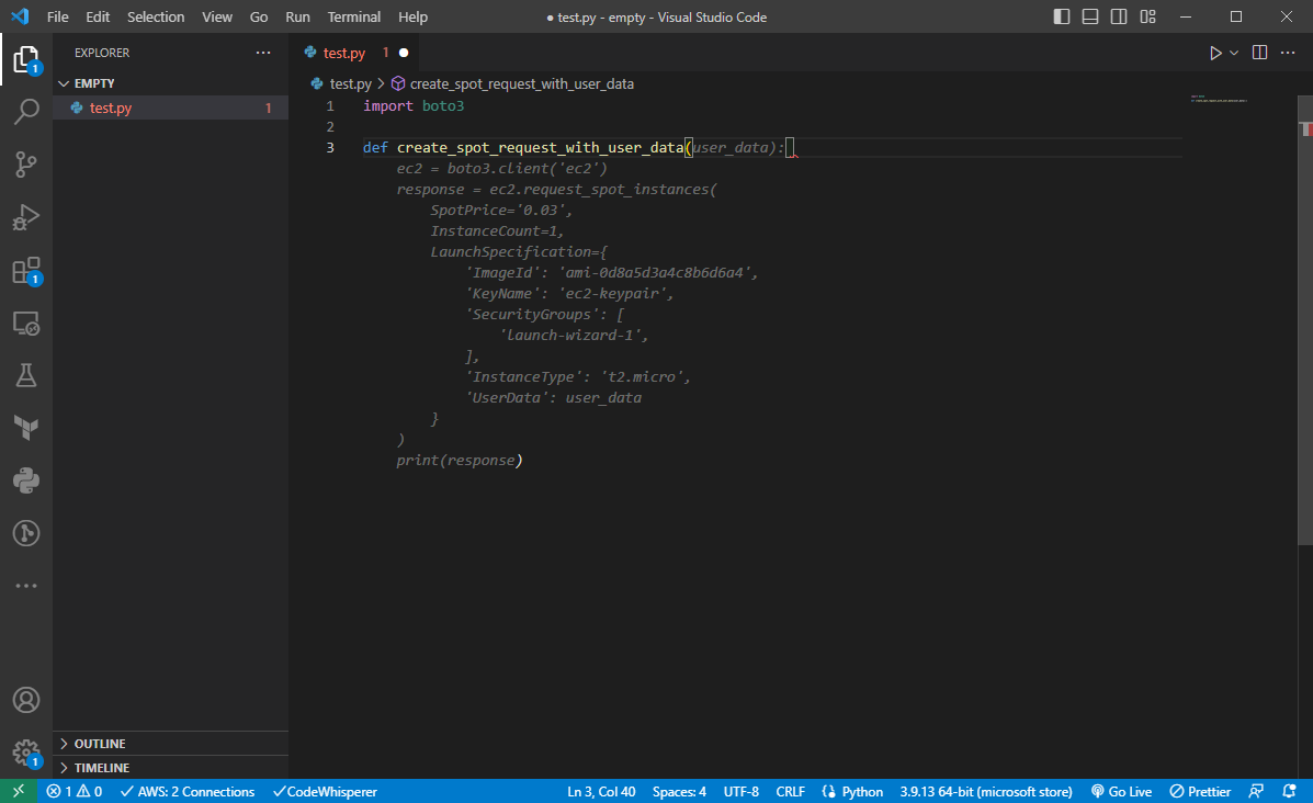 재생 버튼이 일시정지 버튼으로 바뀌었습니다. 이제 자동으로 AWS CodeWhisperer가 당신의 코드를 읽고 제안해줍니다.