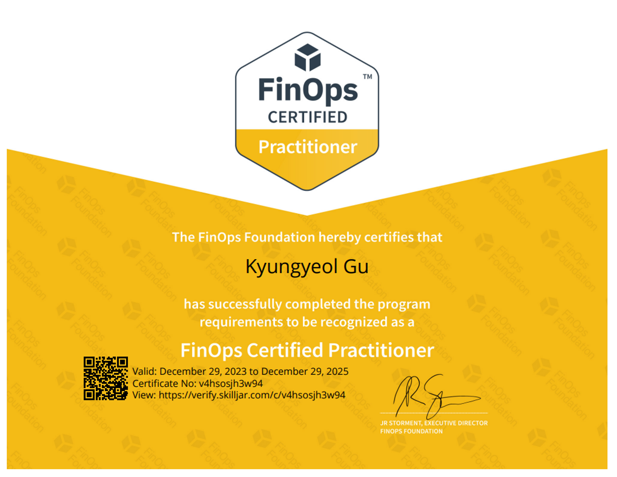 올해 마무리를 장식하기 위한 FinOps 자격증을 도전했다. 결론부터 밝히자면, 좋은 점수로 자격증을 취득했다. FinOps자격증 소개 FinOps(이하 핀옵스)자격증은 핀옵스 재단에서 시행하는 시험을 구매해서, 자격을 검증하는 시험이다. 물론 객관식 시험이다보니 실무를 잘 하느냐와는 조금 다를 수 있다. 하지만, 핀옵스의 문화와 핀옵스를 도입으로 인해서 발생하는 일련의 과정들을 충분히 잘 알고 있는지를 따지는 목적으로는 충분했다고 느꼈다. 자격증의 시험비용은 300달러이고, 시험 결제후 2년간 3회까지 응시를 도전할 수 있는 시험이다. 시험은 50문제 객관식문항이 준비되어 있고, 통과여부는 75퍼센트 이상의 점수를 취득해야한다고 한다. FinOps 자격증 취득 목적 핀옵스 자격증을 취득하게된 목적은, ..